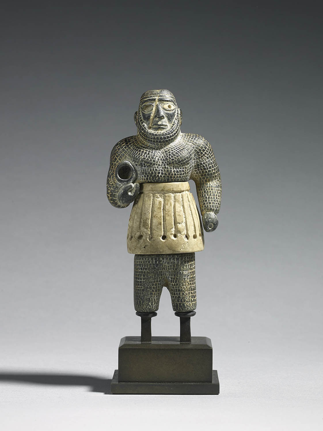 Made with a composite technique incorporating differing combinations of dark chlorite and light coloured alabaster or limestone the figures share several details with the famous 'Scarface' figures of the same period, such as Wyvern Collection inv. 2150 (see below). Around a dozen 'Scarface' figures are known and are named as such due to the deep gash that cuts across their faces (see Caubet 2018, pp.248-249). Similarities can be drawn between the dark body of inv. 2086, the muscular torsos and kilts with inlaid stripes of all three figures, and the thin diadem of inv. 2496.1, with those of the 'Scarface' figure (Caubet 2018, pp.250)
