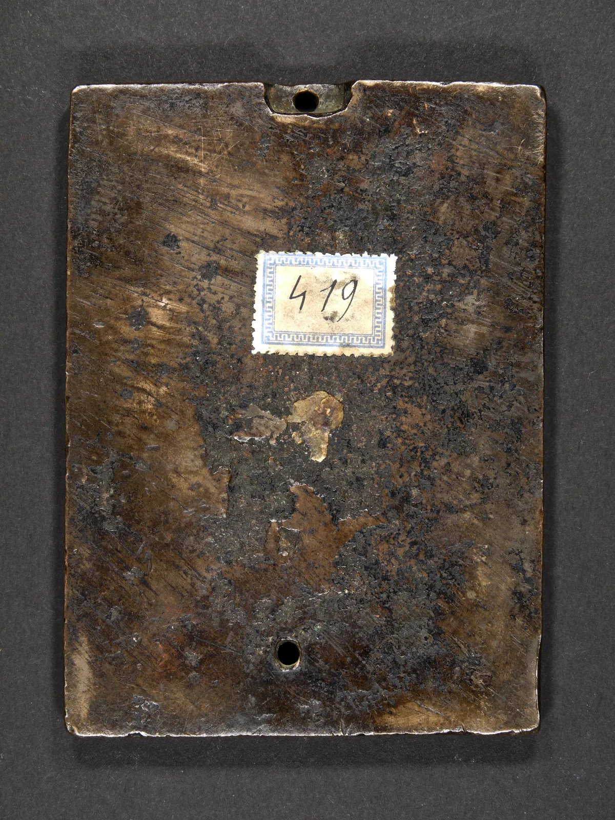 At the centre of this small copper-alloy plaque stands a haloed male figure, identified as St Theodore Stratelates by the two cast inscriptions on either side of him. The saint is depicted bearded and wearing military dress consisting of a cuirass and pteryges (leather or multi-layered fabric strips or lappets) which hang from his shoulders like epaulettes and from his waist to form an armoured skirt, as well as a chlamys (cloak). In his right hand he holds a spear, while his left hand rests on a shield; behind his back hangs a large sword suspended from a shoulder strap.